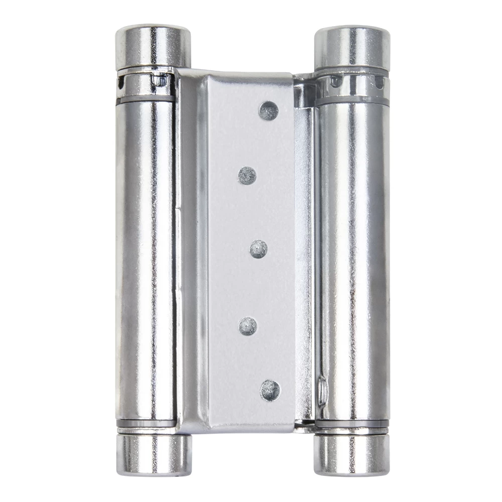 Петля двусторонняя (она же барная, пружинная, петля метро) применяется для деревянных дверей. Позволяет двери открываться в обе стороны, возвращает дверь в центральное положение (в створ). Втулки петель выполнены из техно-полимера, обеспечивают амортизацию, гарантируют тихую и плавную работу, увеличивают срок службы более 200 000 циклов. Специальный тормоз замедляет движение двери и уменьшает количество колебаний, это дает возможность использовать двери большего веса и размера. В комплекте с петлями идут полимерные пластины, облегчающие установку и гарантирующие надежное крепление.