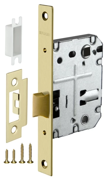 Дверная защелка с пластиковым механизмом Fuaro P72 серии PLASTIC изготовлена в соответствии с требованиями ГОСТ 5089-2003. Предназначена для установки в деревянные межкомнатные двери. Легкая смена направления язычка защелки, подходит для дверей левого и правого открывания. Корпус выполнен из стали с надежным гальваническим покрытием. Ударопрочный пластиковый механизм обеспечивает бесшумность работы защелки. Защелка P72 с усиленным блоком пружин имеет высший 4 класс надежности (250 000 циклов открывания/закрывания). Отверстия под стяжные винты находятся на расстоянии 35-41 мм. Размер бэксета - 50 мм. Размер межосевого расстояния - 70 мм. Возможна установка дверных ручек на стяжные винты для более прочного крепления. Цвет: матовое золото. В комплектацию входят: ответная планка с декоративной вставкой и крепежная фурнитура в цвет изделия.