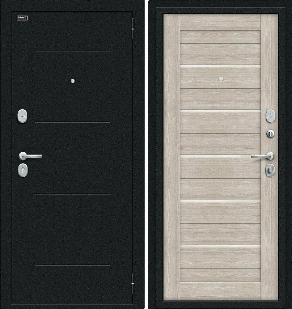 Надежная входная Браво Техно Kale Букле черное/Cappuccino Veralinga премиум класса по цене 33 481 руб. Большая толщина стали защитит от проникновения в ваш дом, квартиру или коттедж. Используется очень качественная фурнитура: замки, цилиндры, ручки, защелки. Покрытие и отделка двери изготовлено под внимательным контролем производителя. Дверь имеет долгий срок службы и гарантию.